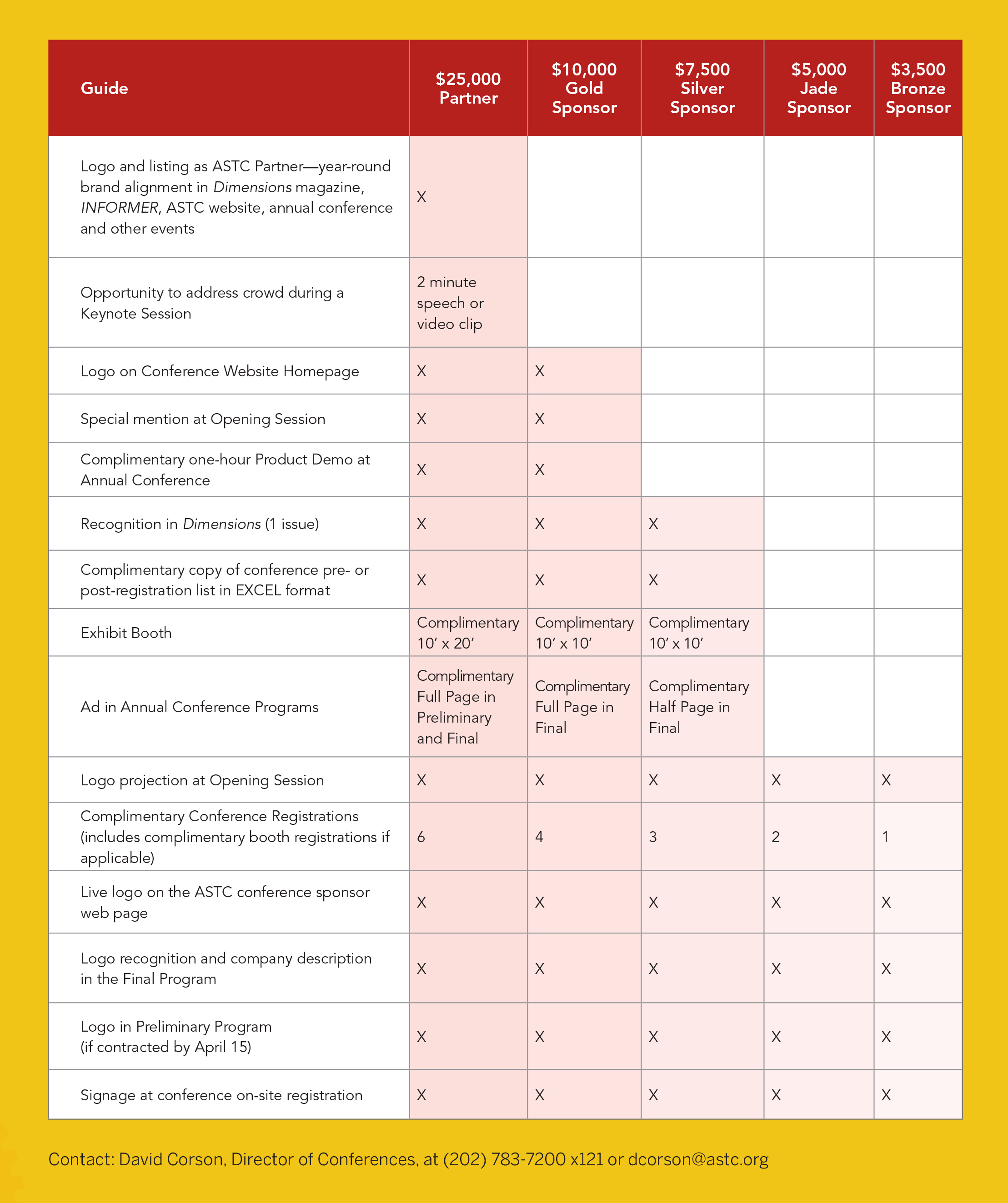 What is your goal in being a sponsor of the ASTC Annual Conference? Who do you want to interact with? What kind of exposure do you want and when do you want it? What best suits your needs in order to maximize your investment in being a sponsor?