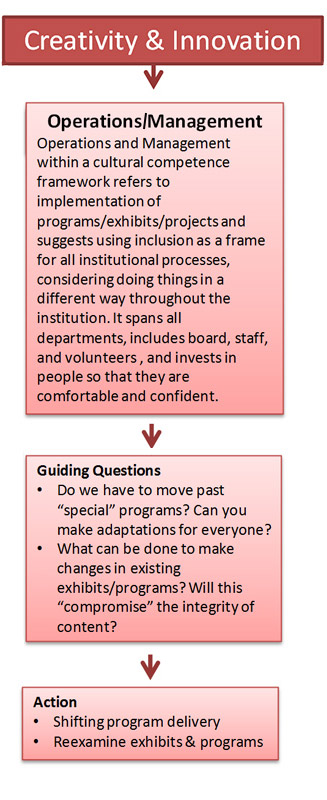 Operations and Management within a cultural competence framework refers to implementation of programs/exhibits/projects and suggests using inclusion as a frame for all institutional processes, considering doing things in a different way throughout the institution. It spans all departments, includes board, staff, and volunteers, and invests in people so that they are comfortable and confident.